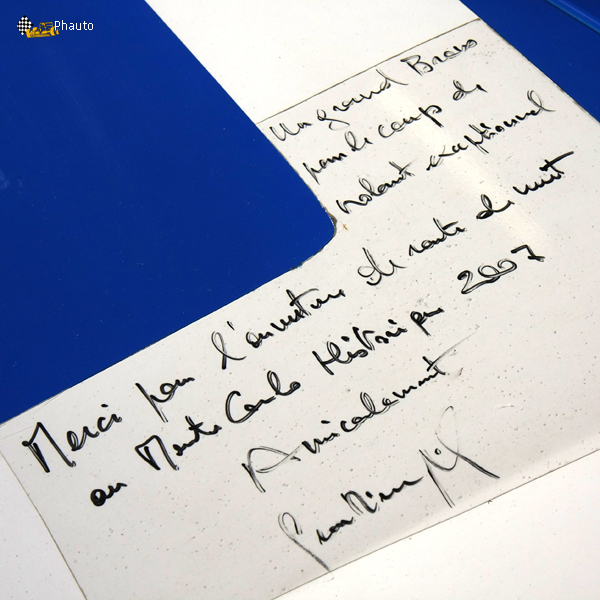 Une petite dédicace sur le capot de la Peugeot 504 Ti de Raymond Hergault et Joëlle Bourg.